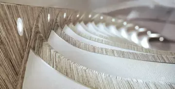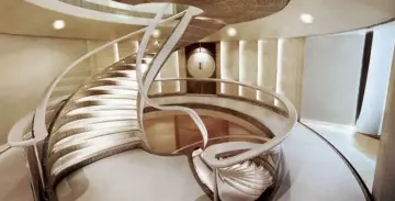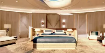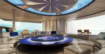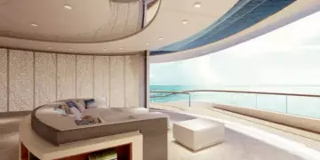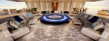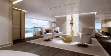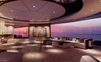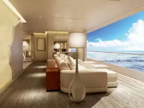 The first impression of Tomorrow is of stunning areas of space and height, with the modern architectural design style reflected in sweeping lines and circular forms, creating an extraordinary, yet functional, spatial experience. Curved ceiling-to-floor glass and panelling on the three top decks of the superstructure and the two other aft decks open up unobstructed views and easy access to the outside areas. The spacious feeling flows through into the main lounge with its imposing interior height of almost three meters.