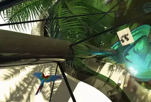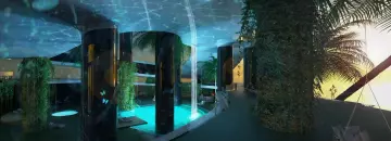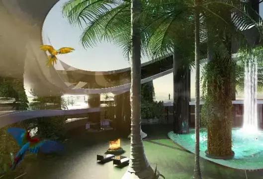 - Jungle deck with pool, waterfall, palm trees, and vertical gardens