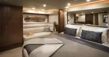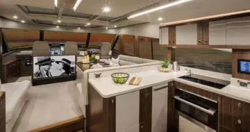 Enter via transom gates into a large, teak-laid cockpit with tender garage beneath, or through the side bulwark doors. Personalise the entire massive saloon area with select fabrics and bespoke finishes. The U-shaped galley, forward dining area and free-standing lounge will all delight. There’s an electric sunroof above. Outside, wide high side decks lead to the sunlovers’ foredeck.