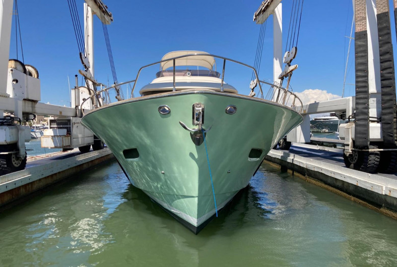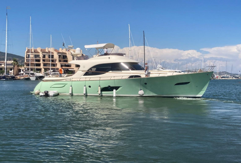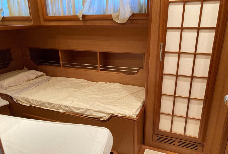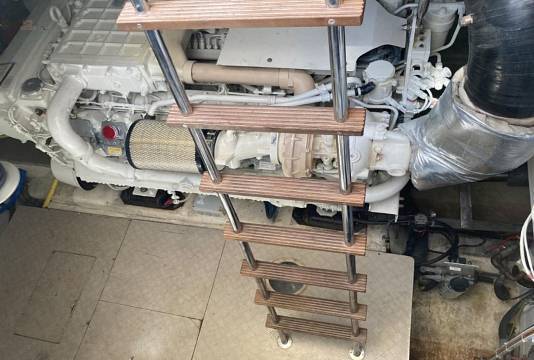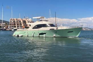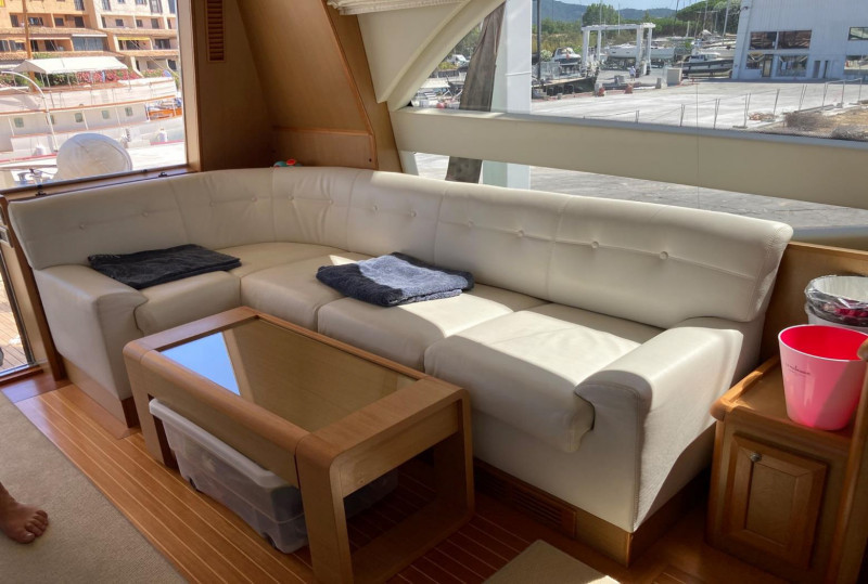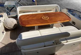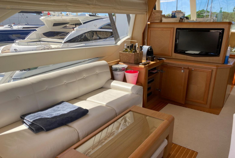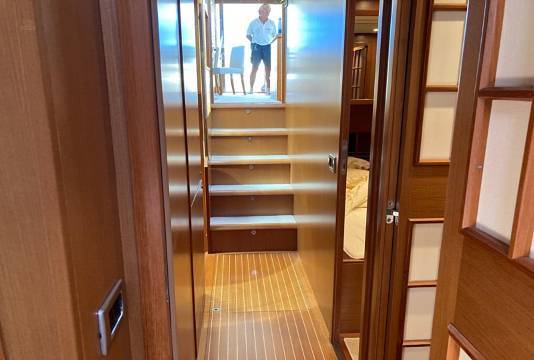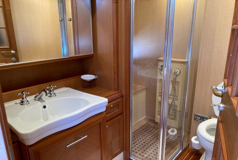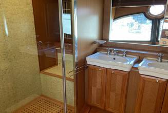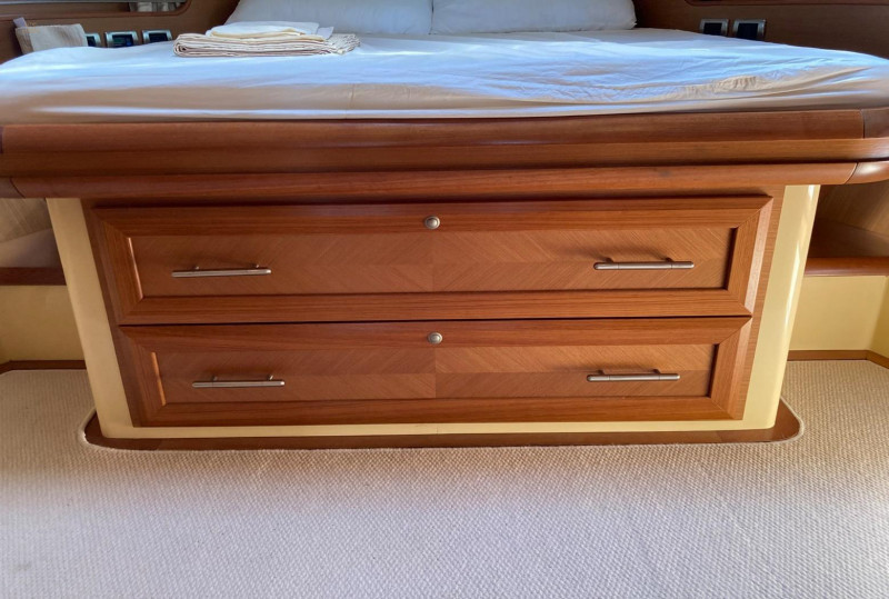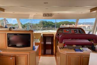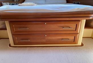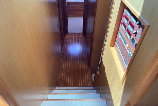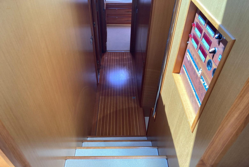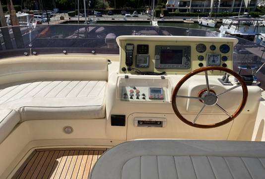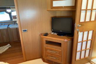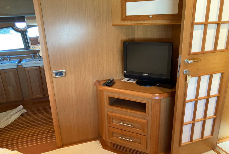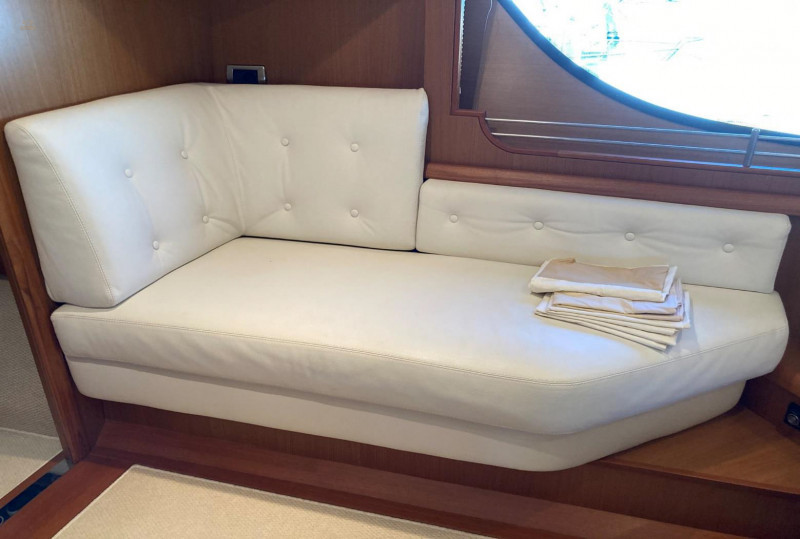Ausstattung:2. Steuerstand auf Fly, Eignerkabine, Flybridge, Gästekajüte, Geräteträger, Innenfahrstand, Marinerokabine, Salon, Schlupfkabine, Teak auf Badeplattform, Teak auf Flybridge, Teak auf Gangborden, Teak auf Stufen zur Flybridge, Teak auf Vorschiff, Teak im Cockpit, Teak in Kabine, WC Elektrisch + Waschbecken + Dusche