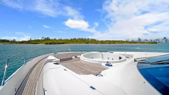 With a top speed of 32 knots and zero speed fin stabilizers, this impeccably-styled sport yacht will get you from point A to point B both quickly and comfortably. Exceptional exterior areas create the perfect atmosphere for entertaining friends and family at sea. A large cockpit with sun lounge, and a jacuzzi with sunpads forward allow you to relax in luxury.