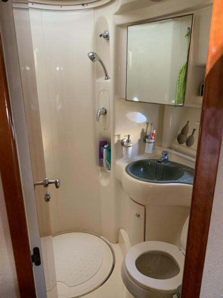 Ausstattung:2. Steuerstand, 2. Steuerstand auf Fly, Bugkabine, Flybridge, Gästekajüte, Geräteträger, Innenfahrstand, Salon, WC Elektrisch + Waschbecken + Dusche