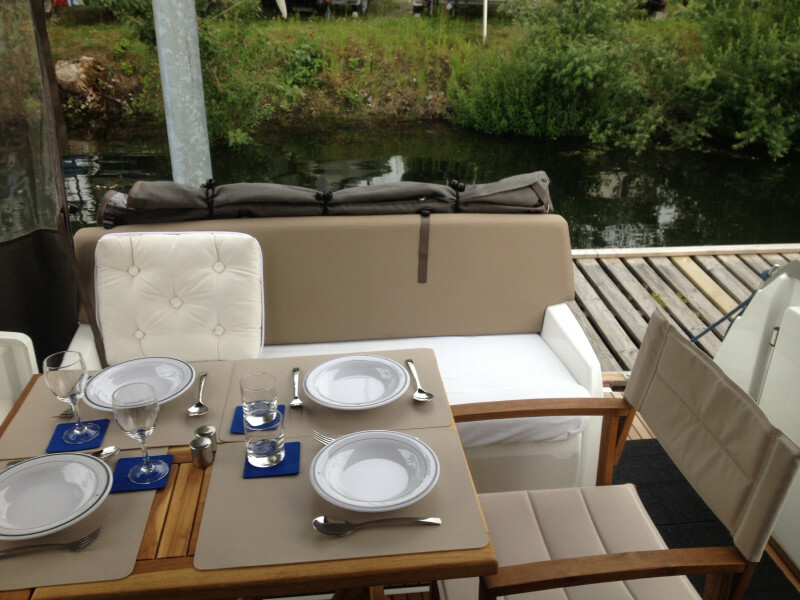 - Cockpit Sonnensegel - Cockpit Persenning - Polsterung im Salon in Leder weiß - Vorhänge rundum im Salon - Ganzpersenning Farbe taupe, Stamoid light Nr 20165