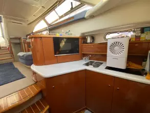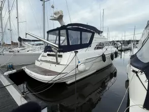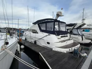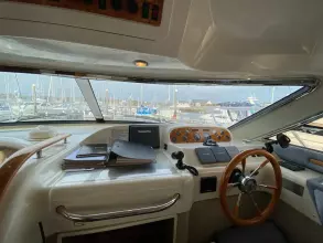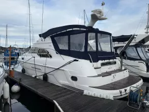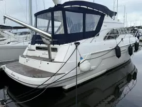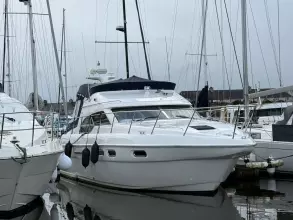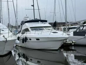 The Sealine F43 Flybridge represents the definitive aft-cabin performance motor yacht for her size. There is a deep, safe cockpit having all-round seating, with storage for the cockpit table and canopy in the flybridge molding. Molded steps to the flybridge allow safe, easy access to the upper seating and sunbed area, and the commanding helm position provides excellent control and visibility. Positioning of deck cleats, electric windlass, and handrails is optimized to make using the F43 a pleasure. Stainless steel window frames and portholes complement the quality feel. The accommodation offers six berths in fore and aft cabins plus a midcabin option. In lieu of a midcabin, owners may prefer the dinette version, which can also be converted into a double berth facility. Both fore and aft cabins have en suite toilets and showers. The large saloon has ample seating, a table, and a sideboard unit that can accommodate an optional saloon fridge and TV / VCR , while providing storage for glasses and bottles. A pullout double seat gives added versatility. The lower level galley has a hob, oven / grill, split sinks, large fridge, provision for microwave, and Corian worktops with ample storage underneath. The F43 is equally at home at sea or at anchor.