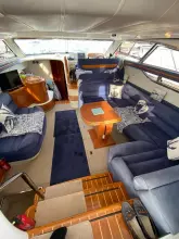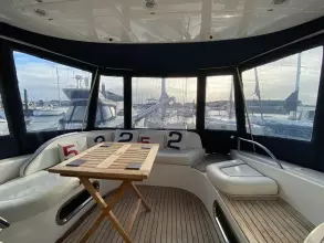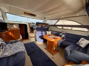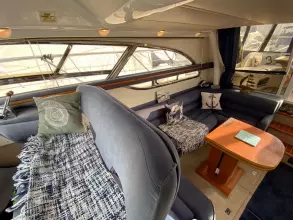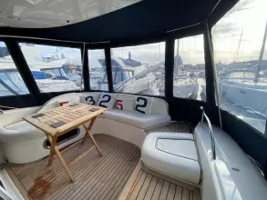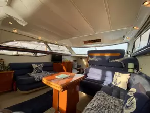 Sealine F43 from 2001 with twin TAMD 63P with circa 780 hours and bow thruster . This is the dinette layout which converts to a double, large aft cabin with en-suit shower and heads, large saloon area with ample sea ting for 8 and separate raised helm station with seating for two. Cockpit with teak and new upholstery back rest, access to stern platform with dinghy crane. Large flybridge with ample seating and all engine controls and instruments repeated.