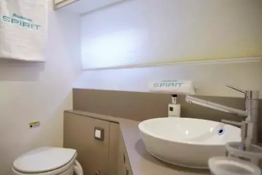 - Guest bathroom with bathroom accessories, worktop and wash basin, general lighting, separate shower with door, electric WC, fibreglass sides and ceiling and side window with integrated porthole.