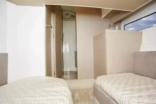 - Guest cabin with twin single berths, hanging locker, venetian blinds, general LED lighting, furniture units and doors, upholstered wall panels, carpeted fibreglass floor and fibreglass ceiling with upholstered panels.